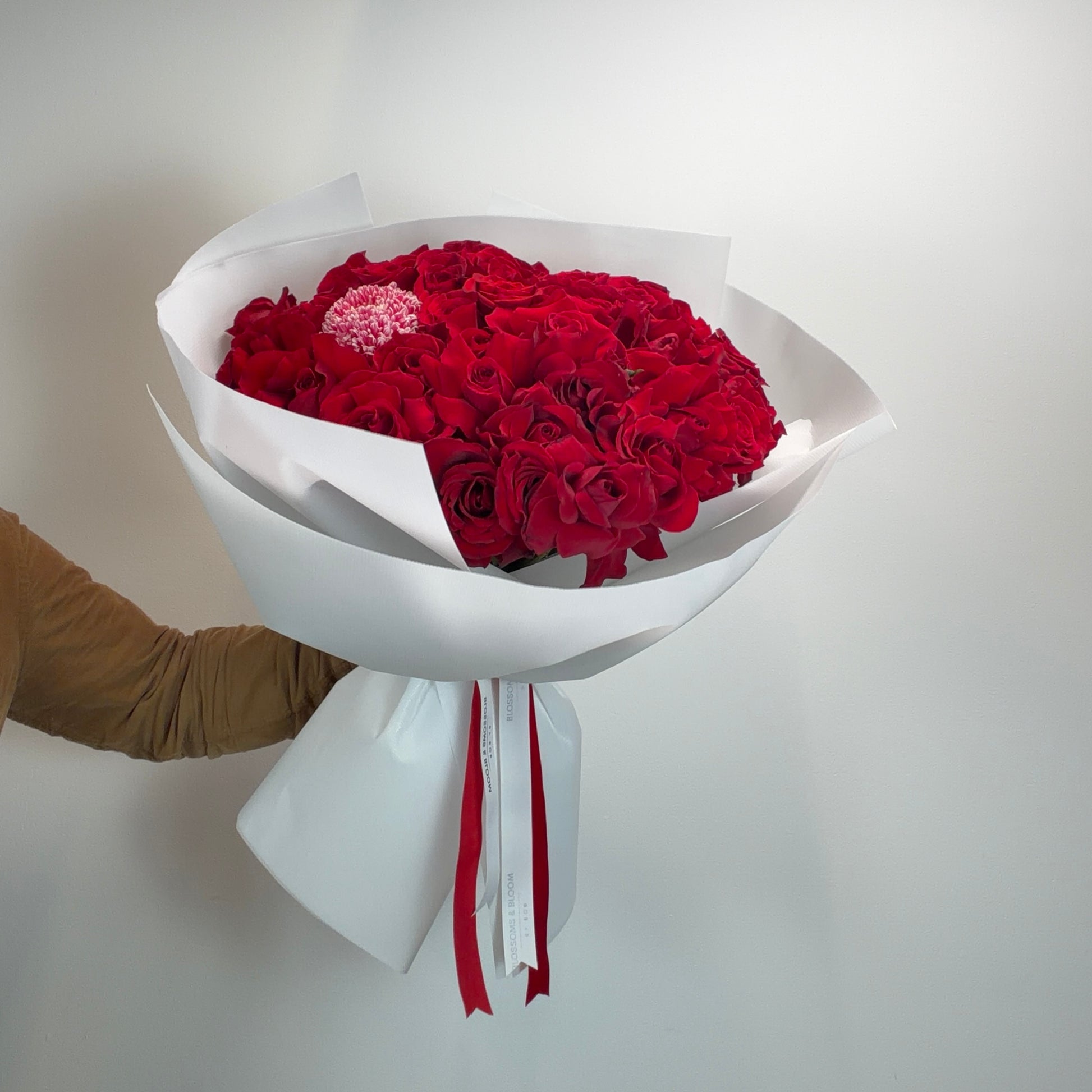 Elegant Love Blend is a beautifully balanced hand-tied rose arrangment designed to express love with softness and passion. Featuring 40 red roses, and 1 stems of chrisantimum , silver, this arrangement blends gentle silver tones with deep red hues for a look that feels both romantic and refined. Ideal for Valentine’s Day, anniversaries, or heartfelt surprises, this bouquet speaks through colour and texture rather than excess. The pink carnations add warmth and charm, while red roses symbolise deep affection, finished with airy limonium for a graceful touch.