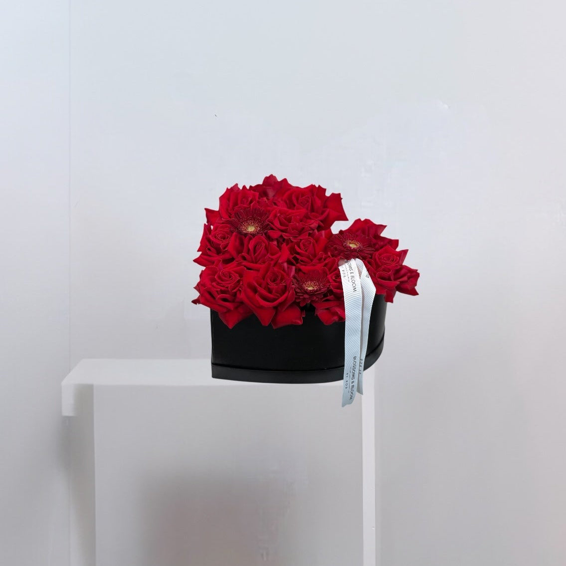 Hand-arranged in a sleek black heart box and finished with an elegant satin ribbon, this floral piece is designed to make a powerful statement of love, passion, and elegance.