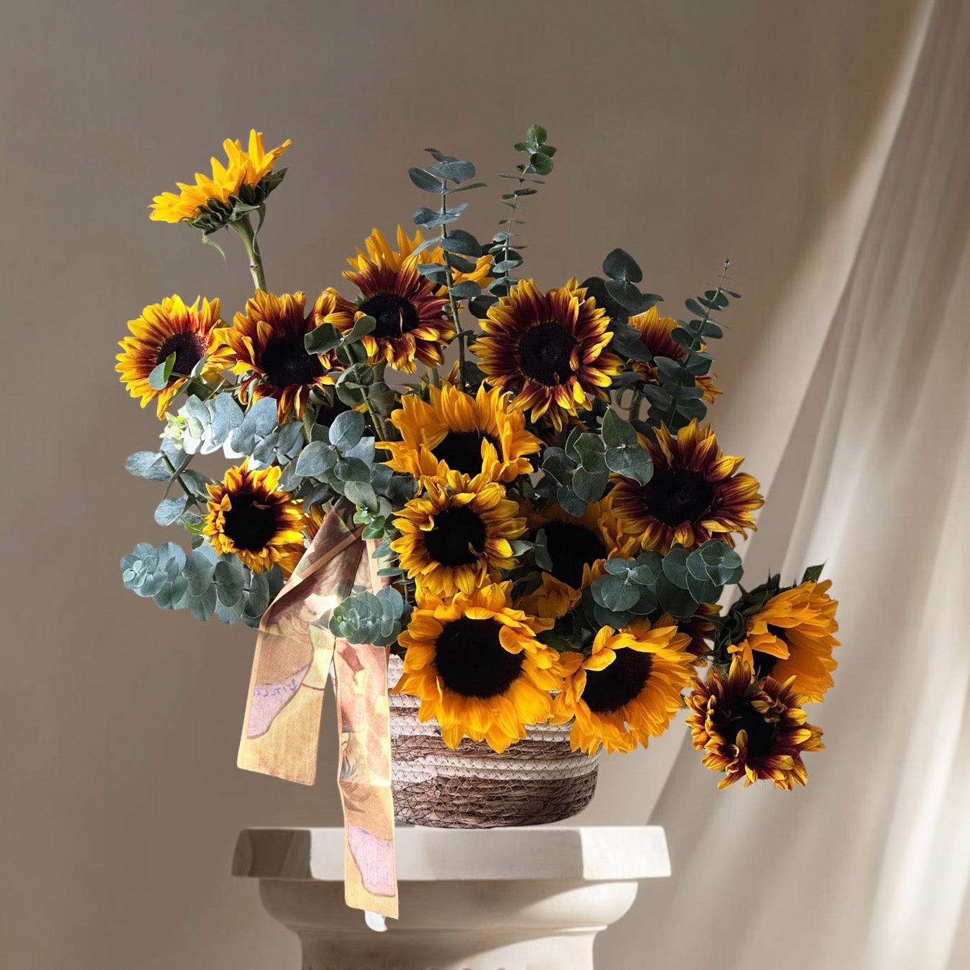 Golden Breeze is a radiant burst of sunshine wrapped in nature’s calming embrace. This cheerful 20 sunflower bouquet, adorned with fresh eucalyptus stems, brings together vibrant warmth and refreshing greenery. Perfect for lifting spirits, celebrating milestones, or simply adding a touch of beauty and charm to any setting. A delightful blend of joy and serenity in every stem.