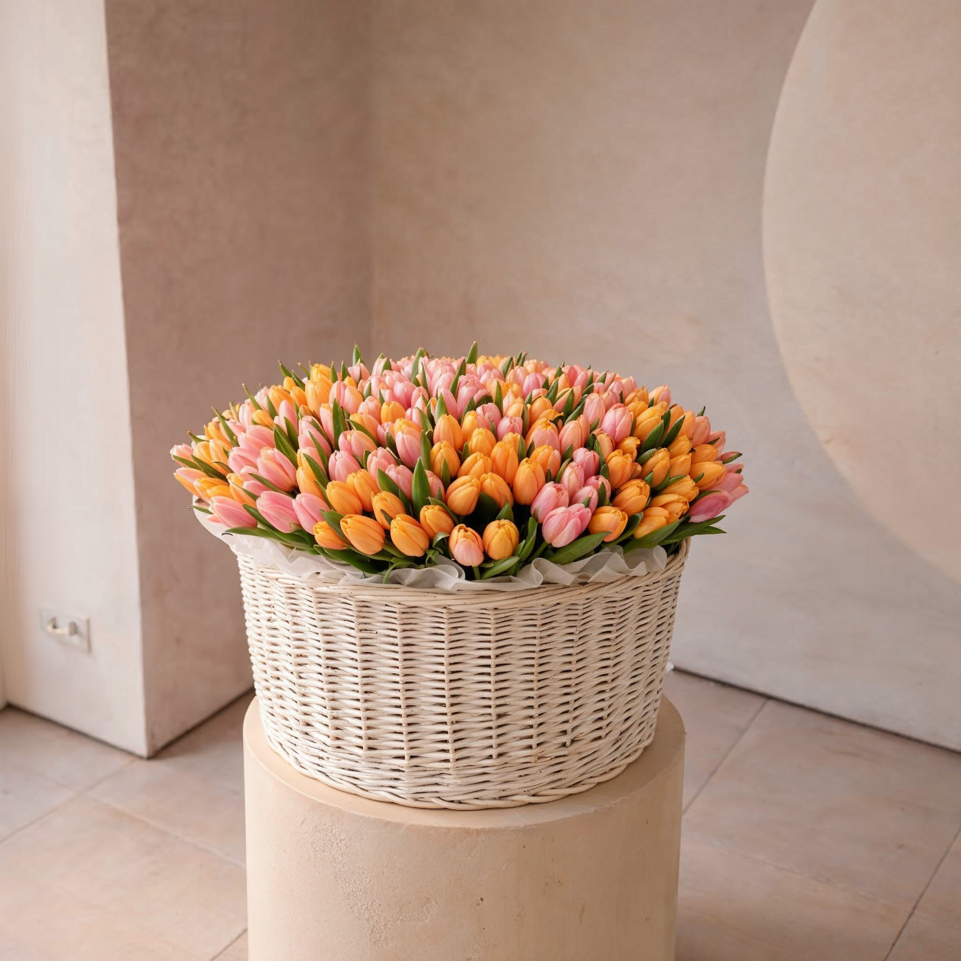 Golden Pearl tulip is a stunning blend of 100 warm orange tones and 100 pink tulip in large basket, crafted into a beautiful arrangement. The basket carries an elegant balance of vibrance and softness, making it a perfect choice for weddings, celebrations, or thoughtful moments. Whether you're expressing joy, gratitude, or affection, this bouquet delivers a touch of golden charm with graceful sophistication.