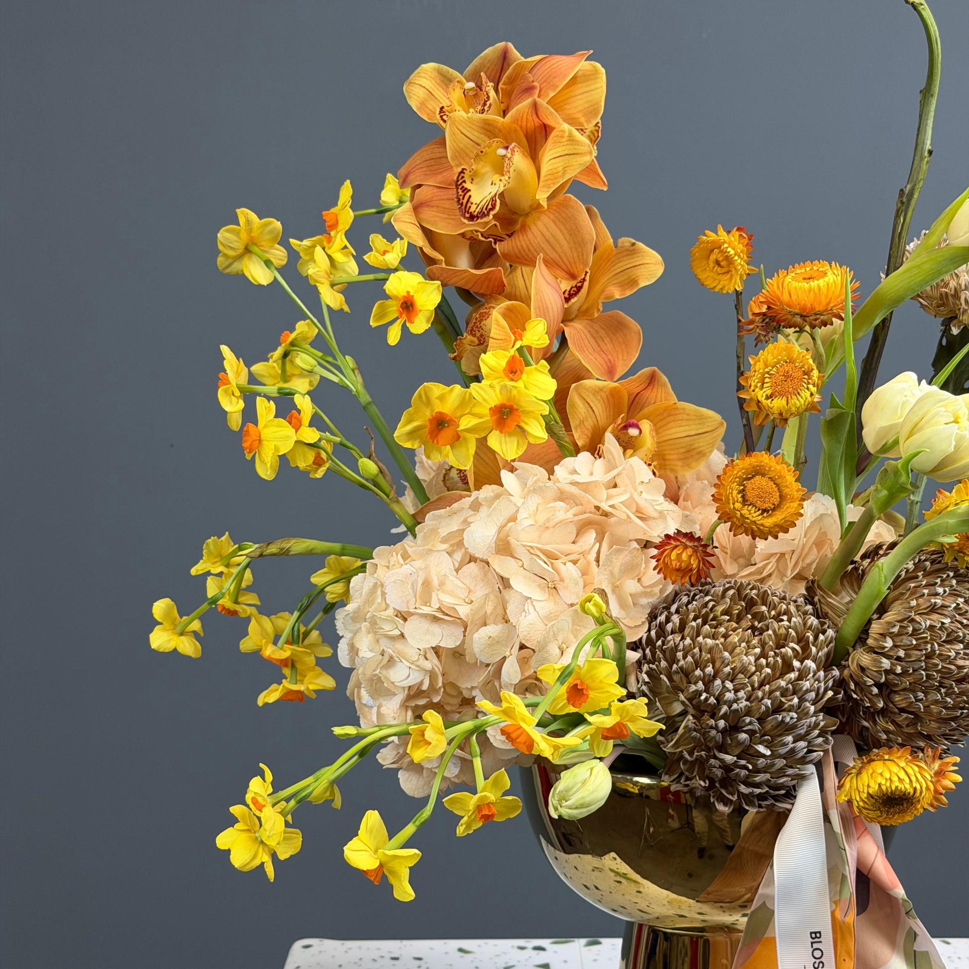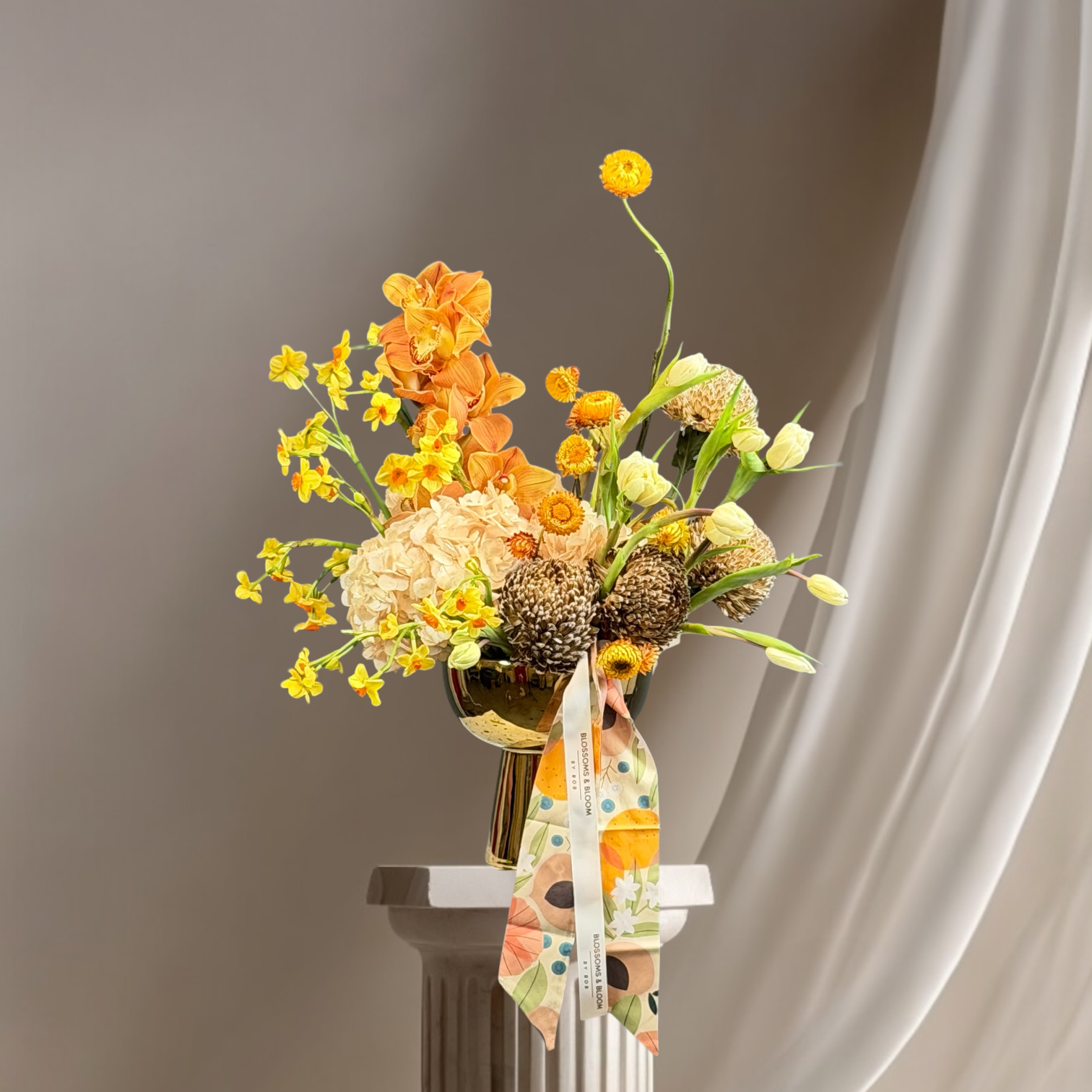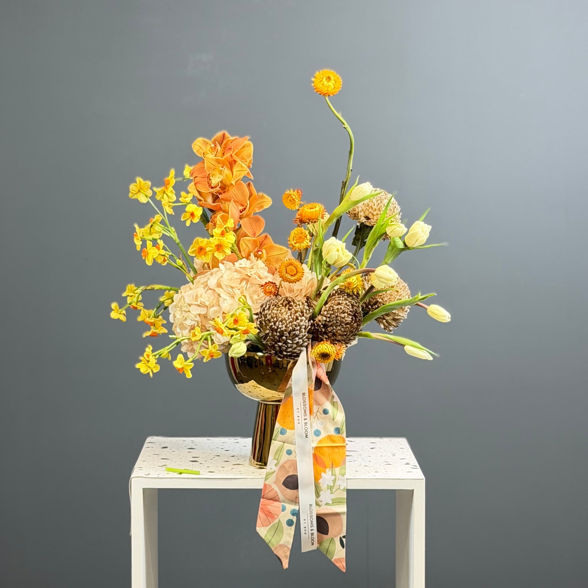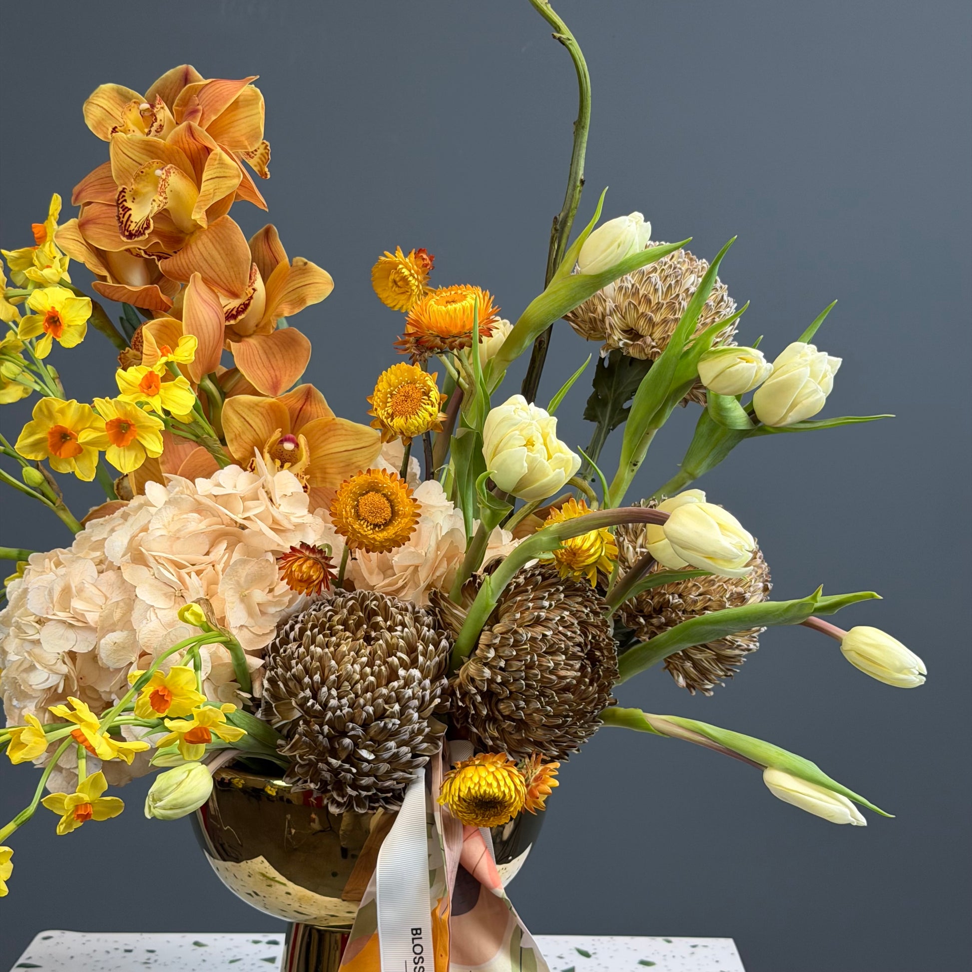 An artistic arrangement featuring warm amber orchids, textured natural elements, 10 head oncidium orchid ,10 craspidia ,10 Anne’s ,10 tulip , vase ,10 tulips beautifully styled in a modern vase. This unique design captures the feeling of a wild garden with rich textures and golden tones, perfect for stylish spaces, celebrations, or as a statement floral gift.