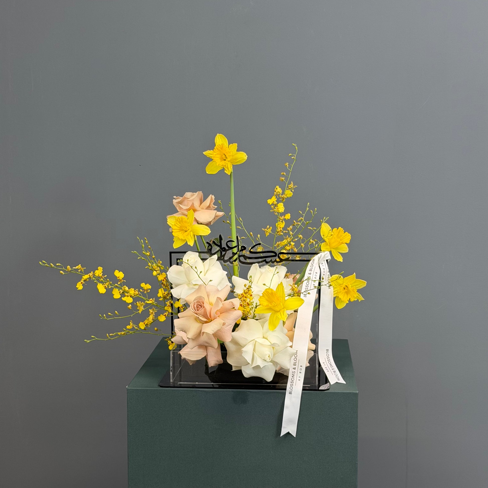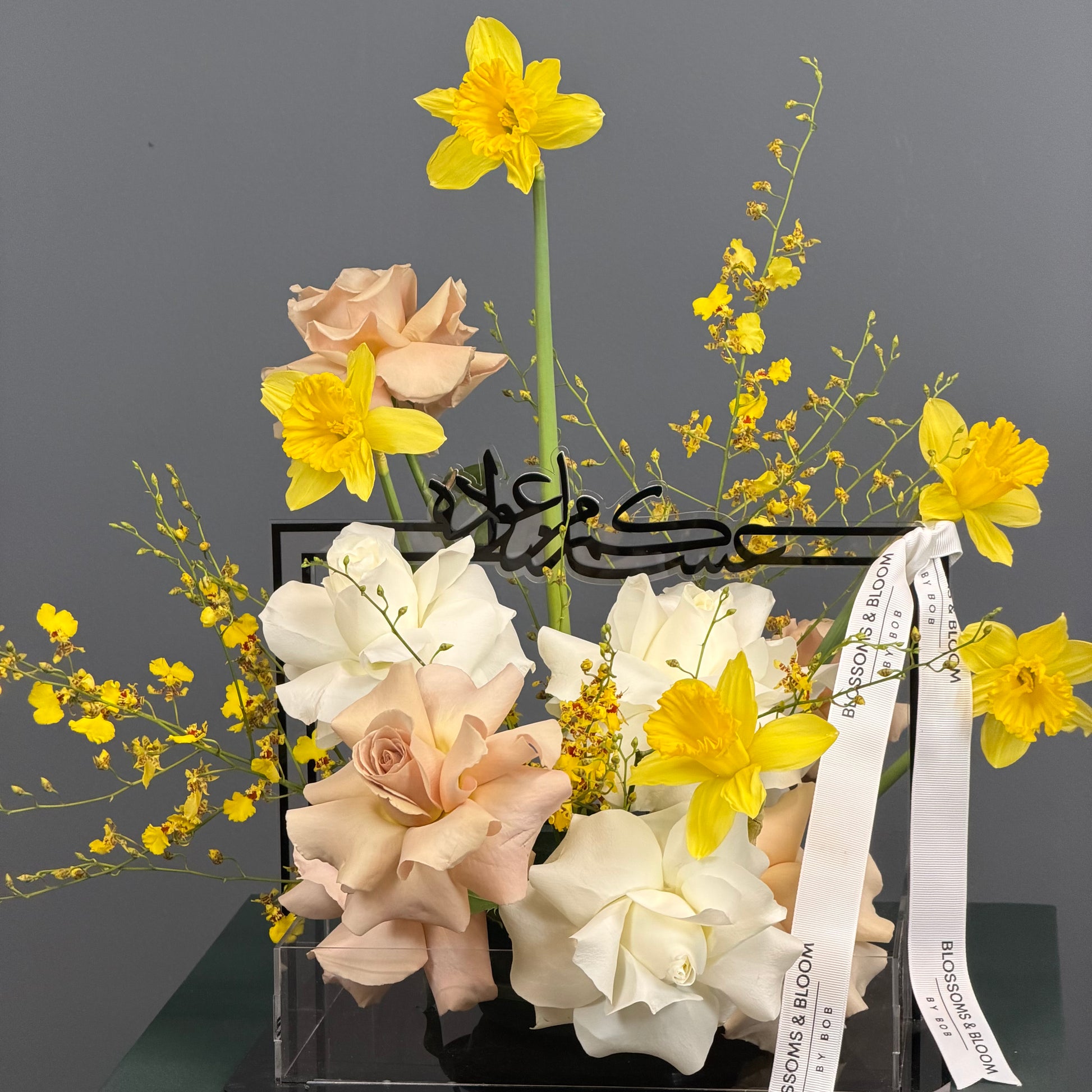 A refined blend of soft 3 yellow orchide , 5 white roses 10 coffee latte 8 narcissus in acrylic box, elevated with vibrant yellow daffodils and delicate oncidium orchids, designed to capture the warmth of sunlight and the elegance of modern luxury.