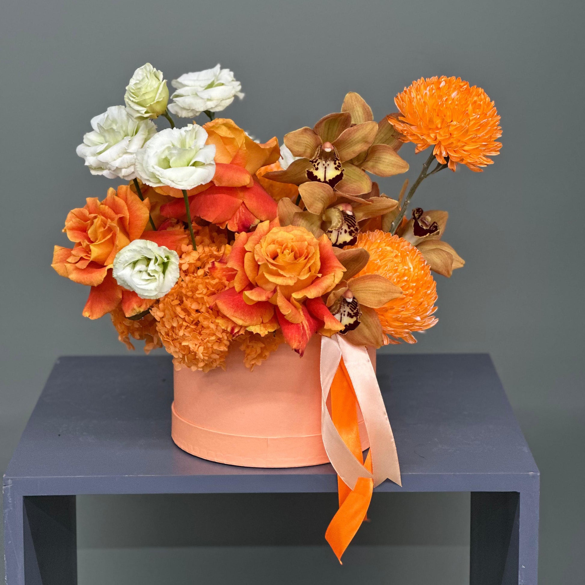 Sunset Whisper is a thoughtfully crafted bouquet presented in a chic orange box, where vibrant roses and elegant orchids come together in a harmonious blend of white and orange. The rich textures and graceful arrangement evoke the serene beauty of a sunset, making it a perfect gesture to express warmth, appreciation, or heartfelt emotion. Ideal for celebrations or simply to brighten someone’s day, this bouquet delivers charm and elegance in every petal.